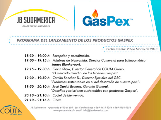 El próximo 20 de marzo a partir de las 18:30 horas, nuestro socio JB SUDAMERICANA, representante del Grupo Australiano Couta Group y distribuidor exclusivo de los sistemas de tuberías Gaspex, hará un evento de lanzamiento en donde mostrará los beneficios de contar con estos productos los cuales además tienen un impacto ambiental y un costo mucho menor que similares disponibles en el mercado. En esta actividad se contará con la presencia de Gavin Shaw, Director General de Couta Group.